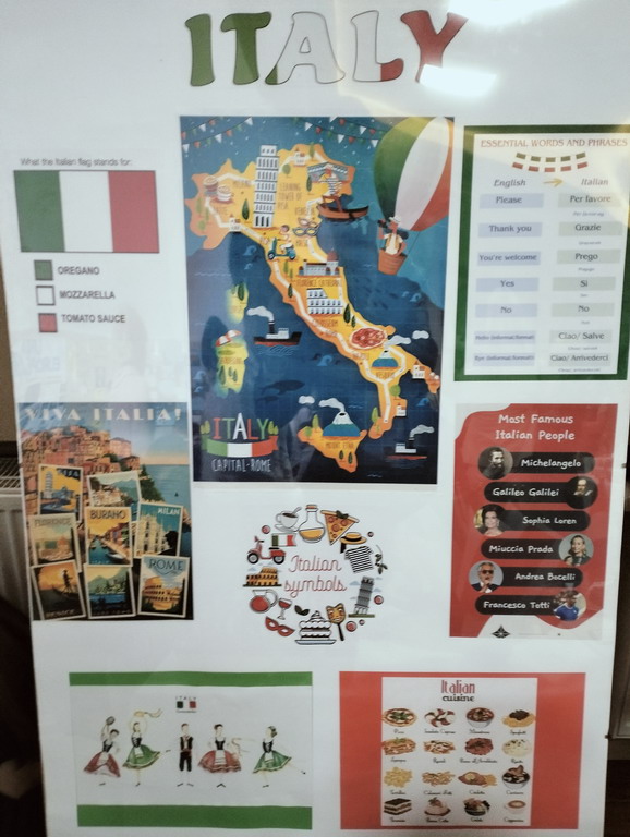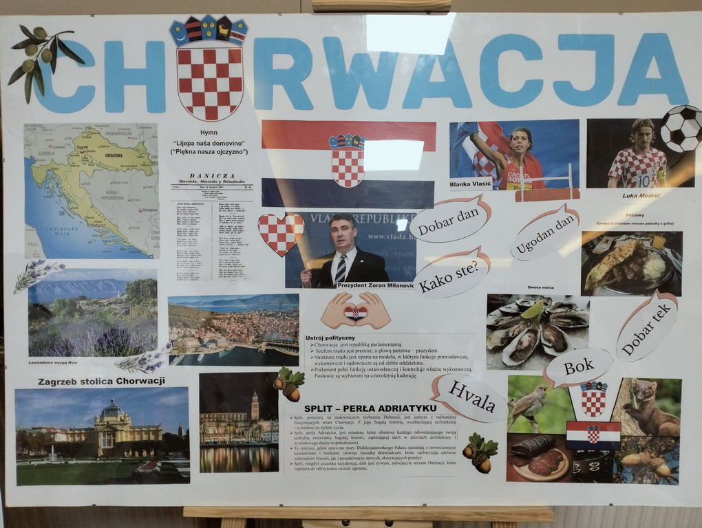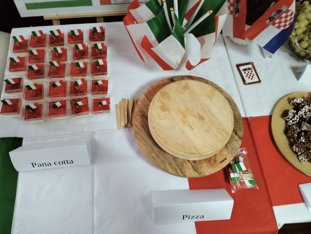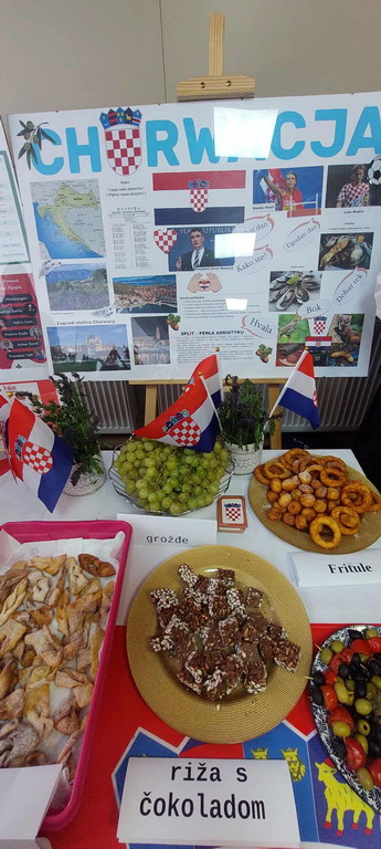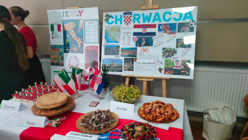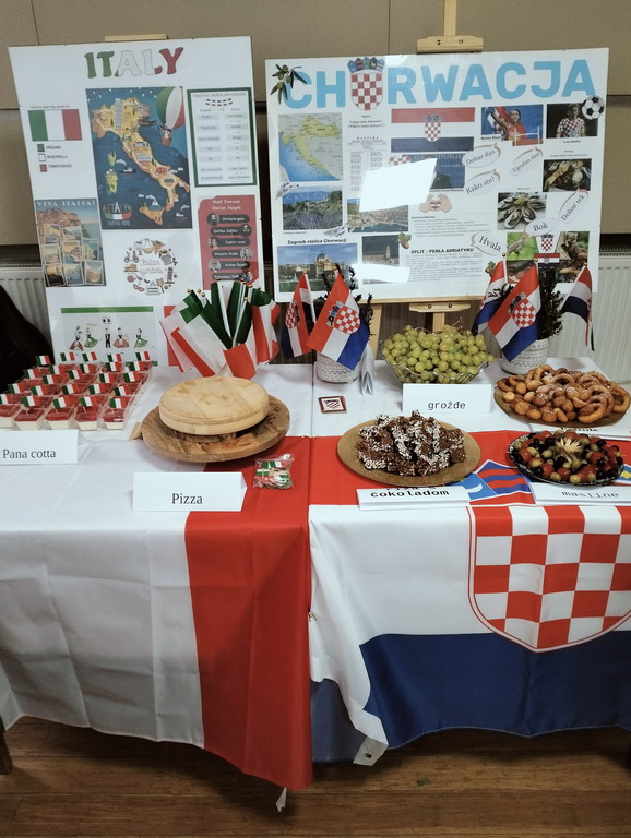 Podczas przerwy uczniowie wraz z wychowawcami przygotowali stoiska tematyczne poświęcone wybranym krajom - z plakatami, quizami i pysznymi przekąskami. Nie zabrakło włoskiej pizzy, panna cotty, a także chorwackich frituli, faworków kroštuli, ryżu w czekoladzie, oliwek i winogron. Wszystko smakowało wyśmienicie! Ponadto klasa VIII wraz z nauczycielem WOSu przygotowała plakat na temat Unii Europejskiej.
