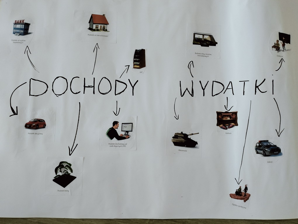 Młodzież dowiedziała się, jakie rodzaje podatków funkcjonują w Polsce i dlaczego każdy obywatel może płacić inne kwoty i otrzymywać różne świadczenia. W grupach powstały także efektowne plakaty przedstawiające dochody i wydatki państwa, przygotowane przy użyciu specjalnych kart z ilustracjami.