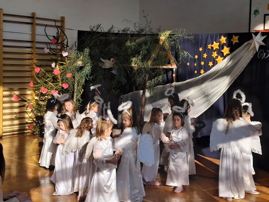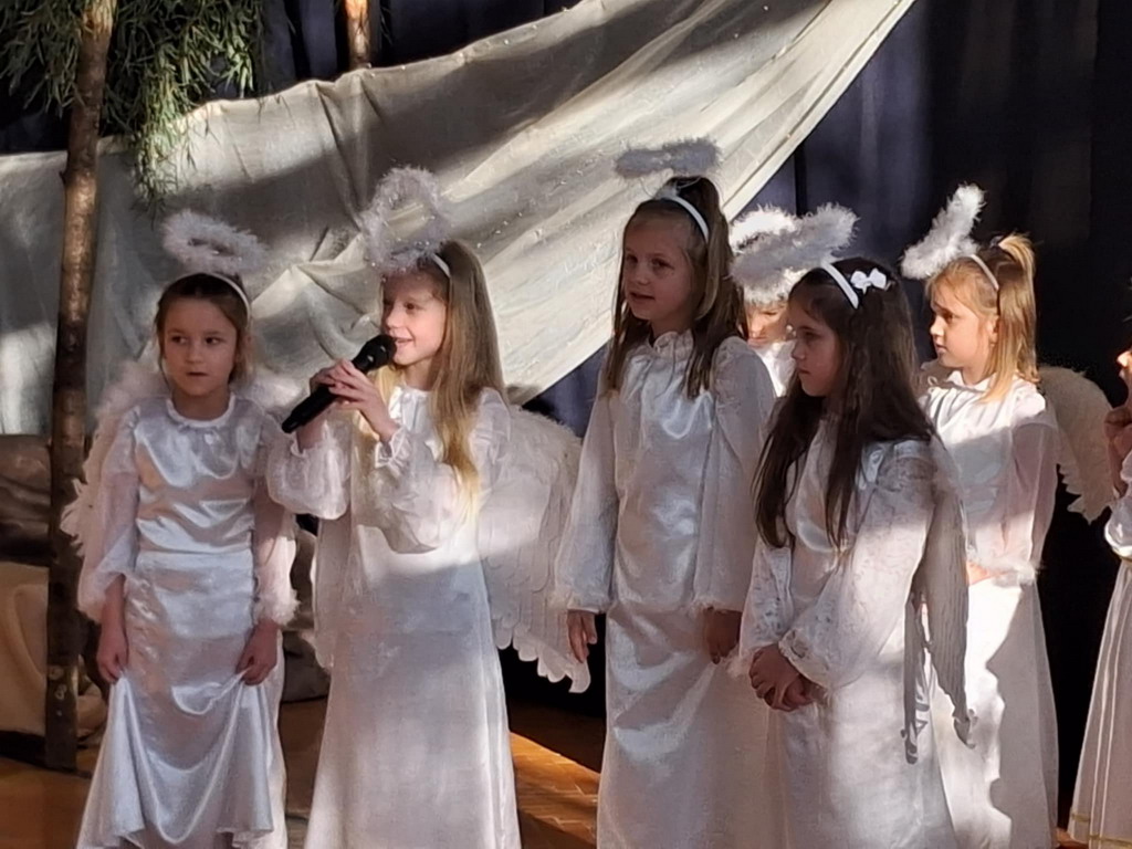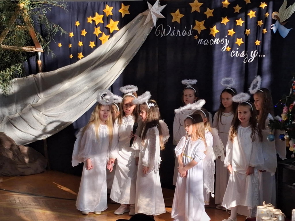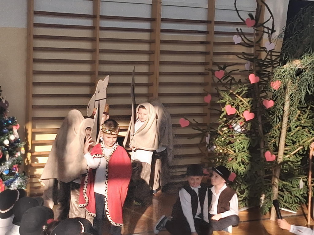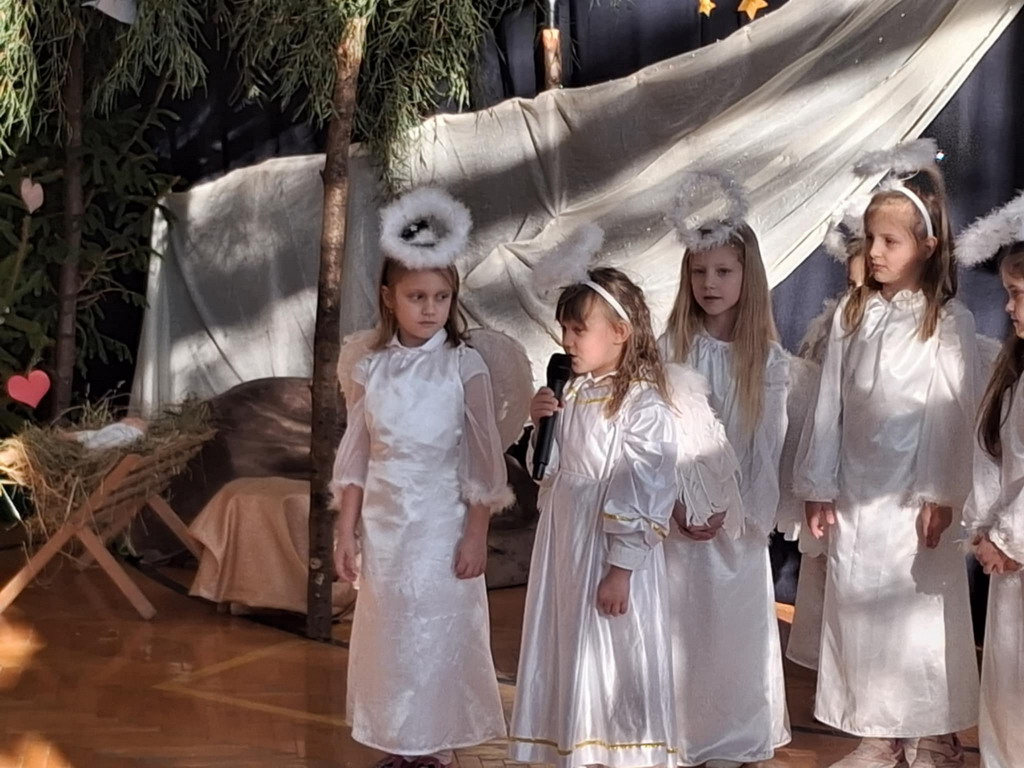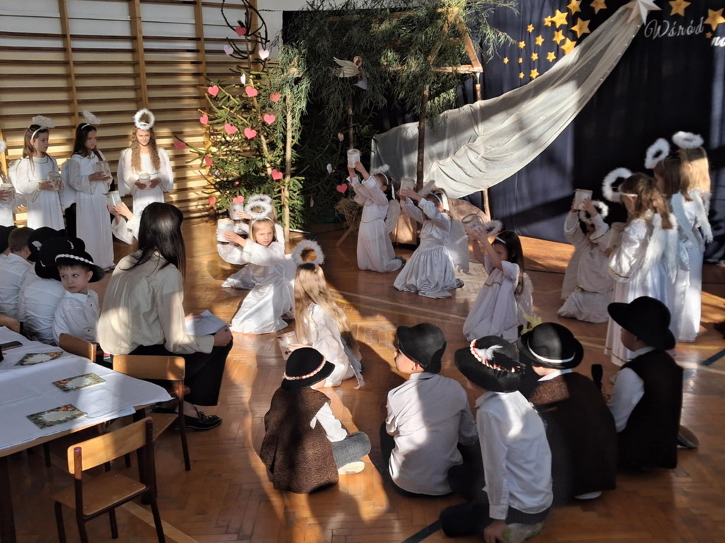 W dniu 19.12.2025r. w naszej szkole odbyła się uroczysta wigilia szkolna, pełna wzruszeń, radości i świątecznego ciepła. Dzieci z oddziału przedszkolnego oraz uczniowie klasy I przygotowali piękne przedstawienie bożonarodzeniowe, które wprowadziło wszystkich w magiczny, świąteczny nastrój. Po akademii wysłuchaliśmy koncertu kolęd w wykonaniu uczniów naszej szkoły, a następnie nadszedł wyjątkowy moment dzielenia się opłatkiem i składania życzeń.