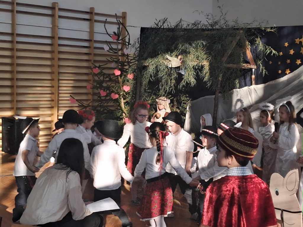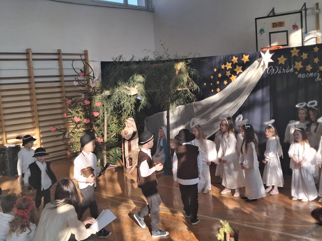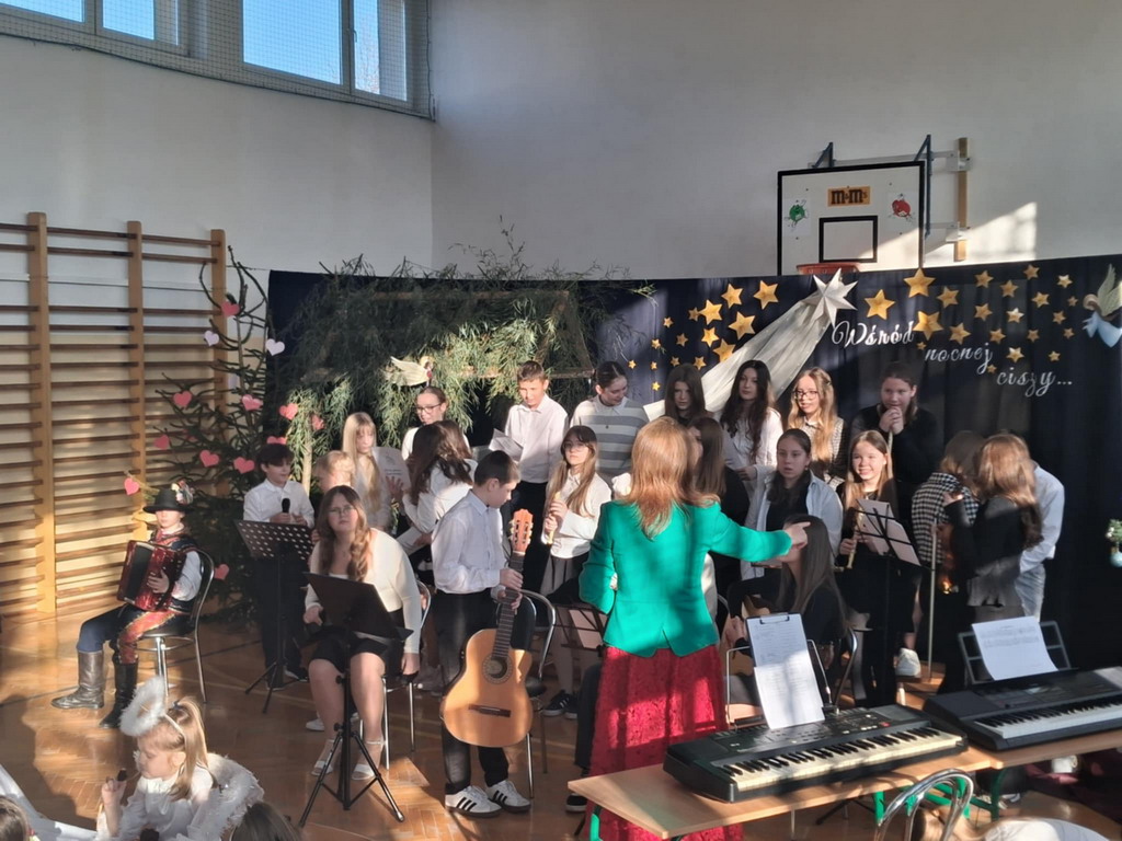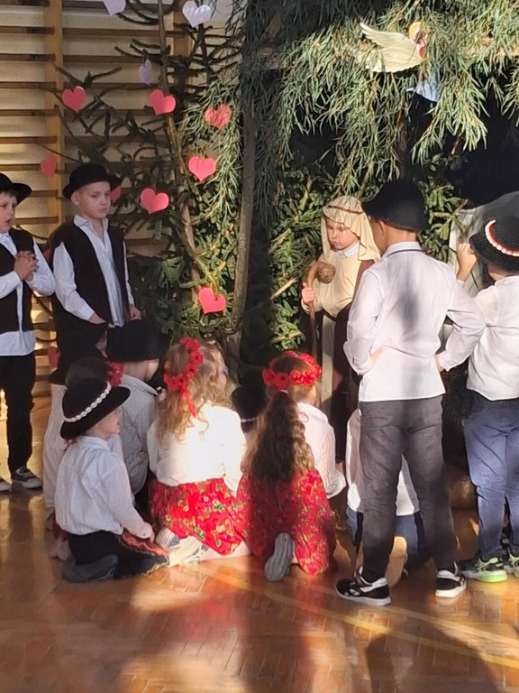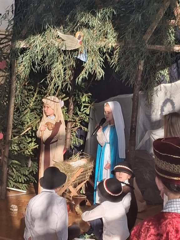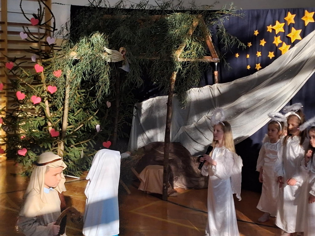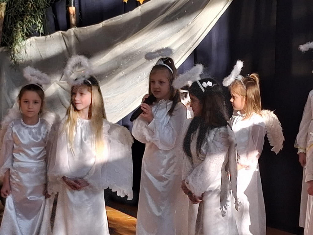 W dniu 19.12.2025r. w naszej szkole odbyła się uroczysta wigilia szkolna, pełna wzruszeń, radości i świątecznego ciepła. Dzieci z oddziału przedszkolnego oraz uczniowie klasy I przygotowali piękne przedstawienie bożonarodzeniowe, które wprowadziło wszystkich w magiczny, świąteczny nastrój. Po akademii wysłuchaliśmy koncertu kolęd w wykonaniu uczniów naszej szkoły, a następnie nadszedł wyjątkowy moment dzielenia się opłatkiem i składania życzeń.