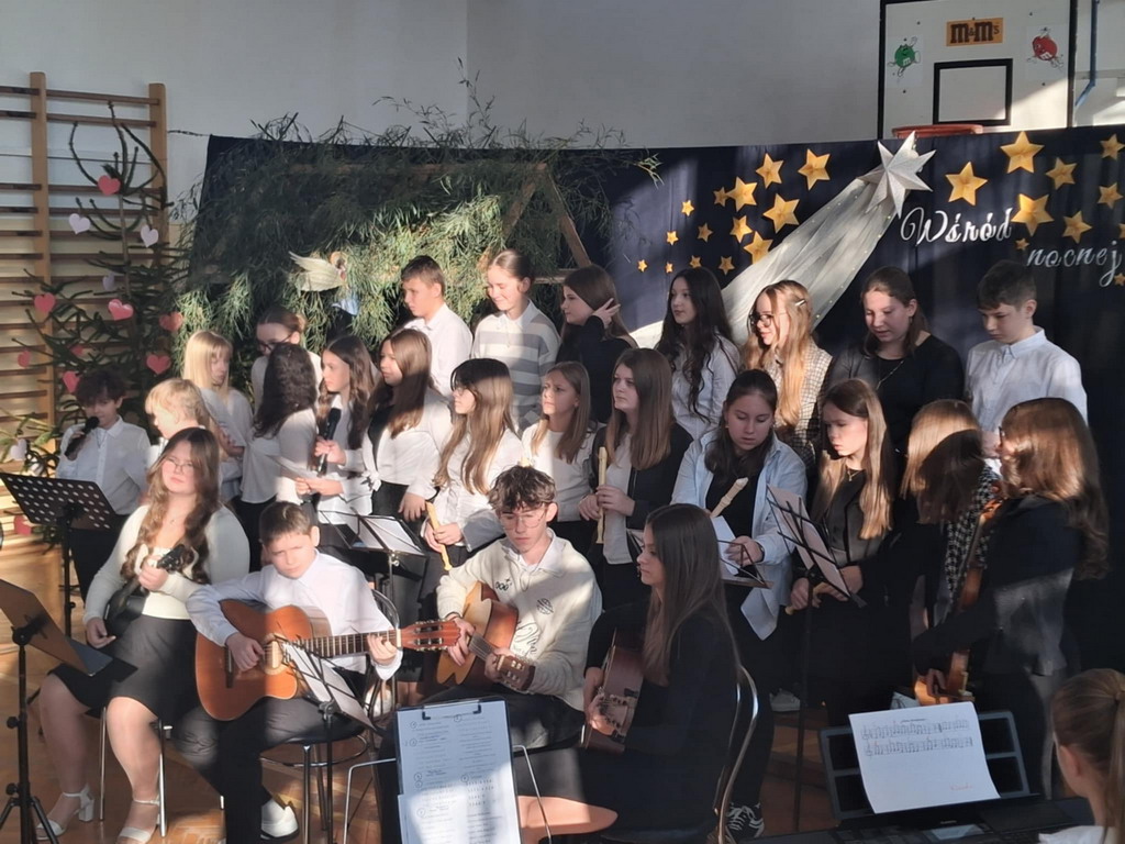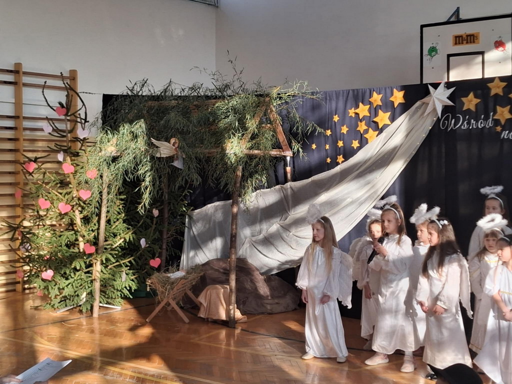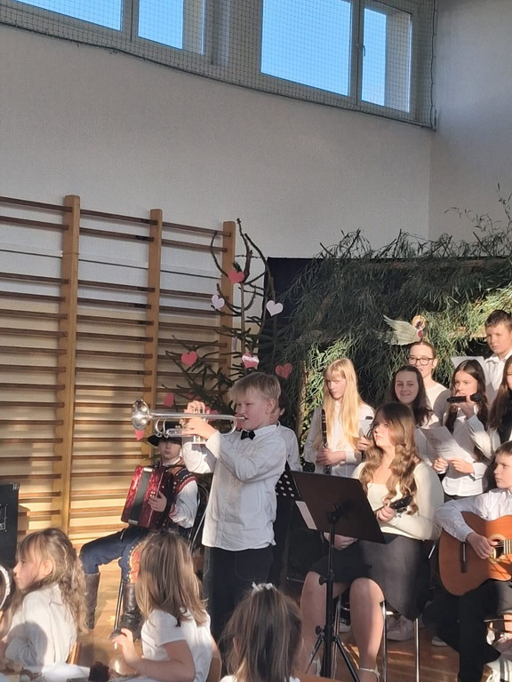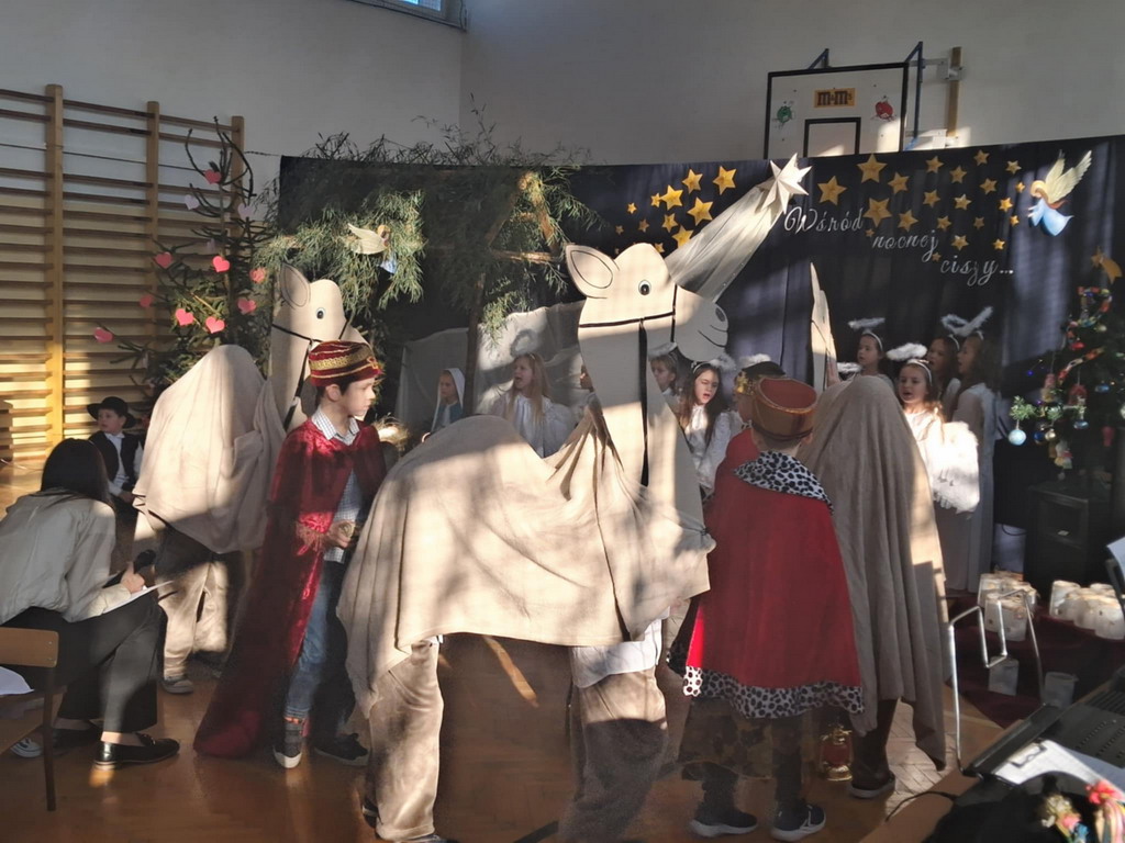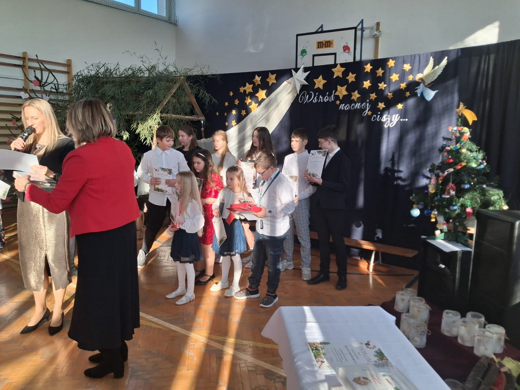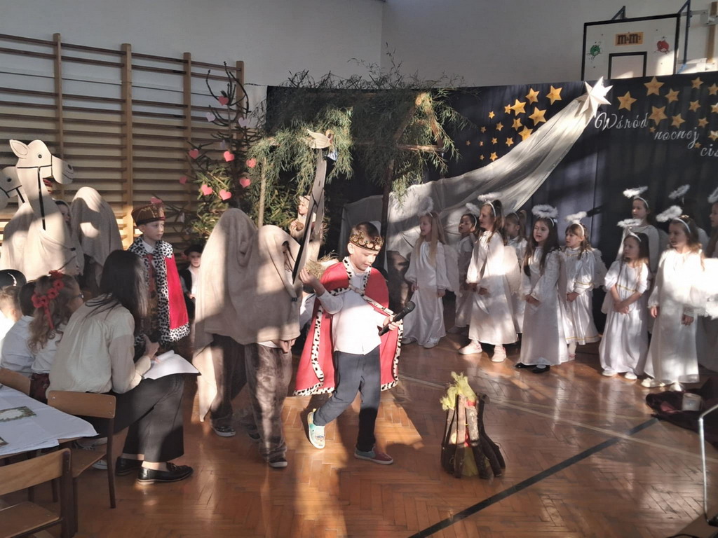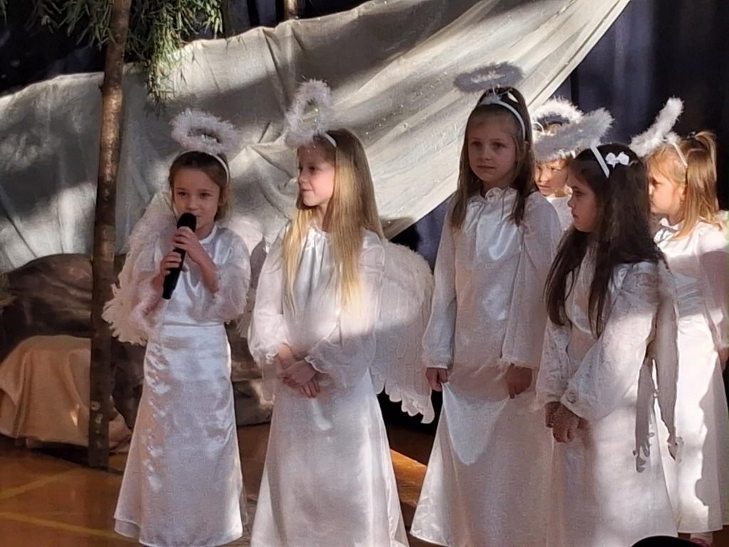 W dniu 19.12.2025r. w naszej szkole odbyła się uroczysta wigilia szkolna, pełna wzruszeń, radości i świątecznego ciepła. Dzieci z oddziału przedszkolnego oraz uczniowie klasy I przygotowali piękne przedstawienie bożonarodzeniowe, które wprowadziło wszystkich w magiczny, świąteczny nastrój. Po akademii wysłuchaliśmy koncertu kolęd w wykonaniu uczniów naszej szkoły, a następnie nadszedł wyjątkowy moment dzielenia się opłatkiem i składania życzeń.